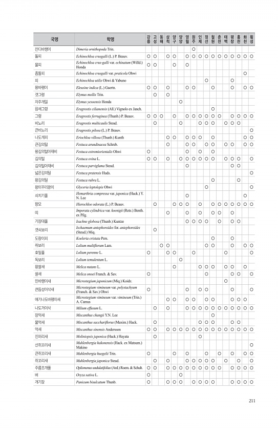 211 잔디바랭이 Dimeria ornithopoda Trin. ○ 돌피 Echinochloa crusgalli L. P. Beauv. ○ ○ ○ ○ ○ ○ ○ ○ ○ ○ ○ ○ ○ ○ ○ 물피 Echinochloa crus-galli var. echinatum Willd. Honda ○ ○ ○ ○ 좀돌피 Echinochloa crusgalli var. praticola Ohwi ○ 피 Echinochloa utilis Ohwi & Yabuno ○ ○ 왕바랭이 Eleusine indica L. Gaertn. ○ ○ ○ ○ ○ ○ ○ ○ ○ 갯그령 Elymus mollis Trin. ○ ○ 자주개밀 Elymus yesoensis Honda ○ 참새그령 Eragrostis cilianensis All. Vign...