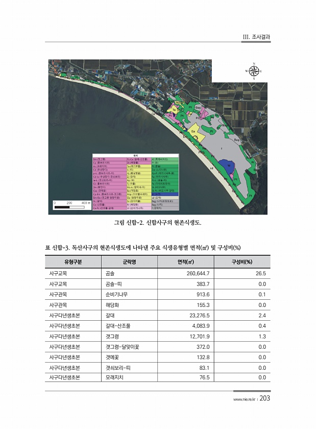 III. 조사결과 www.nie.re.kr ?203 그림 신합-2. 신합사구의 현존식생도. 유형구분 군락명 면적 ㎡ 구성비 % 사구교목 곰솔 260,644.7 26.5 사구교목 곰솔-띠 383.7 0.0 사구관목 순비기나무 913.6 0.1 사구관목 해당화 155.3 0.0 사구다년생초본 갈대 23,276.5 2.4 사구다년생초본 갈대-산조풀 4,083.9 0.4 사구다년생초본 갯그령 12,701.9 1.3 사구다년생초본 갯그령-달맞이꽃 372.0 0.0 사구다년생초본 갯메꽃 132.8 0.0 사구다년생초본 갯쇠보리-띠 83.1 0.0 사구다년생초본 모래지치 76.5 0.0 표 신합-3. 독산사구의 현존식생도에 나타낸 주요 식생유형별 면적 ㎡ 및 구성비 %