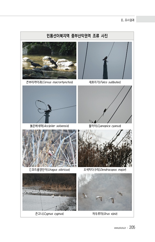 Ⅱ. 조사결과 www.nie.re.kr ? 205 민통선이북지역 중부산악권역 조류 사진 큰부리까마귀 Corvus macrorhynchos 새호리기 Falco subbuteo 붉은배새매 Accipiter soloensis 물까치 Cyanopica cyanus 긴꼬리홍양진이 Uragus sibiricus 오색딱다구리 Dendrocopos major 큰고니 Cygnus cygnus 재두루미 Grus vipio
