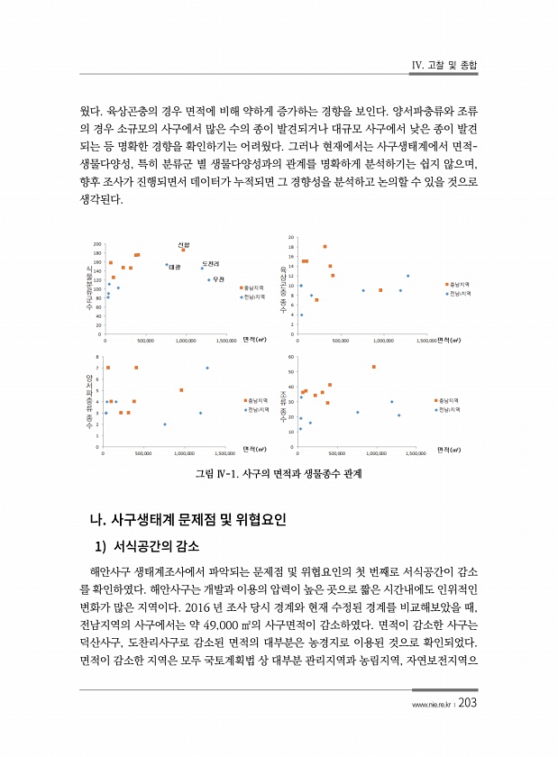 IV. 고찰 및 종합 www.nie.re.kr ?203 웠다. 육상곤충의 경우 면적에 비해 약하게 증가하는 경향을 보인다. 양서파충류와 조류 의 경우 소규모의 사구에서 많은 수의 종이 발견되거나 대규모 사구에서 낮은 종이 발견 되는 등 명확한 경향을 확인하기는 어려웠다. 그러나 현재에서는 사구생태계에서 면적- 생물다양성, 특히 분류군 별 생물다양성과의 관계를 명확하게 분석하기는 쉽지 않으며, 향후 조사가 진행되면서 데이터가 누적되면 그 경향성을 분석하고 논의할 수 있을 것으로 생각된다. 그림 Ⅳ-1. 사구의 면적과 생물종수 관계 1 해안사구 생태계조사에서 파악되는 문제점 및 위협요인의 첫 번째로 서식공간이 감소 를 확인하였다. 해안사구는 개발과 이용의 압력이 높은 곳으로 짧은 시간내에도 인위적인 변화가 많은...