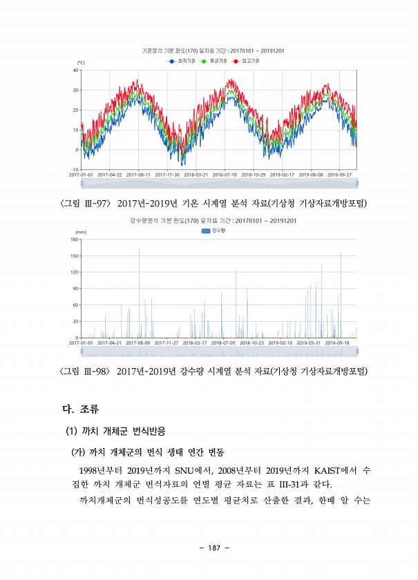 187 그림 Ⅲ-97 2017년-2019년 기온 시계열 분석 자료 기상청 기상자료개방포털 그림 Ⅲ-98 2017년-2019년 강수량 시계열 분석 자료 기상청 기상자료개방포털 다. 조류 1 까치 개체군 번식반응 가 까치 개체군의 번식 생태 연간 변동 1998년부터 2019년까지 SNU에서, 2008년부터 2019년까지 KAIST에서 수 집한 까치 개체군 번식자료의 연별 평균 자료는 표 III-31과 같다. 까치개체군의 번식성공도를 연도별 평균치로 산출한 결과, 한배 알수는