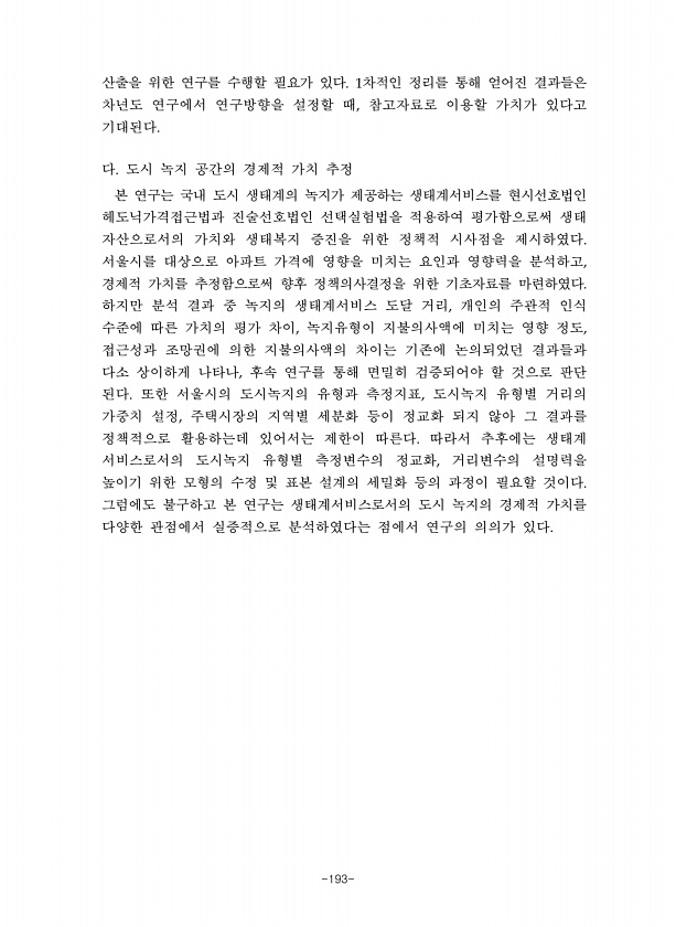 -193- 산출을 위한 연구를 수행할 필요가 있다 차적인 정리를 통해 얻어진 결과들은 차년도 연구에서 연구방향을 설정할 때 참고자료로 이용할 가치가 있다고 기대된다 다 도시 녹지 공간의 경제적 가치 추정 본 연구는 국내 도시 생태계의 녹지가 제공하는 생태계서비스를 현시선호법인 헤도닉가격접근법과 진술선호법인 선택실험법을 적용하여 평가함으로써 생태 자산으로서의 가치와 생태복지 증진을 위한 정책적 시사점을 제시하였다 서울시를 대상으로 아파트 가격에 영향을 미치는 요인과 영향력을 분석하고 경제적 가치를 추정함으로써 향후 정책의사결정을 위한 기초자료를 마련하였다 하지만 분석 결과 중 녹지의 생태계서비스 도달 거리 개인의 주관적 인식 수준에 따른 가치의 평가 차이 녹지유형이 지불의사액에 미치는 영향 정도 접근성과 조망...