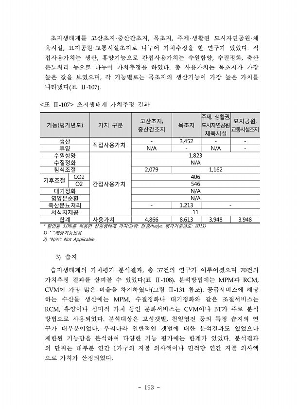 193 초지생태계를 고산초지 중산간초지 목초지 주제 생활권 도시자연공원 체 육시설 묘지공원 교통시설초지로 나누어 가치추정을 한 연구가 있었다 직 접사용가치는 생산 휴양기능으로 간접사용가치는 수원함양 수질정화 축산 분뇨처리 등으로 나누어 가치추정을 하였다 총 사용가치는 목초지가 가장 높은 값을 보였으며 각 기능별로는 목초지의 생산기능이 가장 높은 가치를 나타냈다 표 기능 평가년도 가치 구분 고산초지, 중산간초지 목초지 주제, 생활권, 도시자연공원 체육시설 묘지공원, 교통시설초지 생산 직접사용가치 3,452 휴양 N/A N/A 수원함양 간접사용가치 1,823 수질정화 N/A 침식조절 2,079 1,162 기후조절 CO2 406 O2 546 대기정화 N/A 영양분순환 N/A 축산분뇨처리 1,213 서식처제공 11...