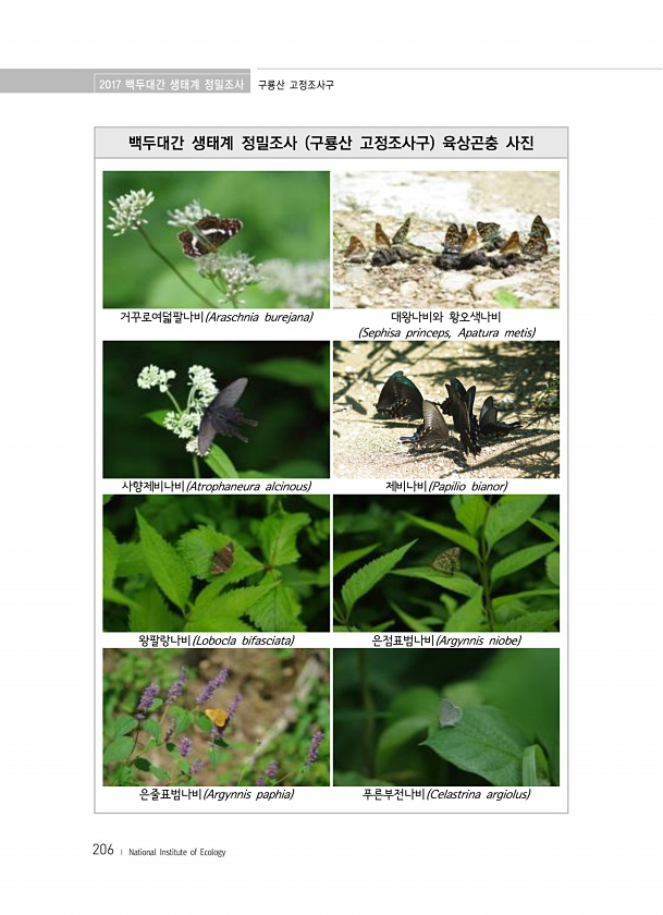 2017 백두대간 생태계 정밀조사 구룡산 고정조사구 206 ? National Institute of Ecology 백두대간 생태계 정밀조사 구룡산 고정조사구 육상곤충 사진 거꾸로여덟팔나비 Araschnia burejana 대왕나비와 황오색나비 Sephisa princeps, Apatura metis 사향제비나비 Atrophaneura alcinous 제비나비 Papilio bianor 왕팔랑나비 Lobocla bifasciata 은점표범나비 Argynnis niobe 은줄표범나비 Argynnis paphia 푸른부전나비 Celastrina argiolus