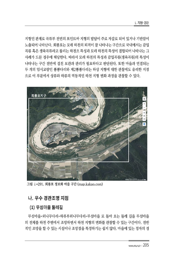 i. 지형·경관 www.nie.re.kr ?205 지형인 관계로 곡류부 전면의 포인트바 지형의 발달이 주로 자갈로 되어 있거나 기반암이 노출되어 나타난다. 회룡포는 모래 하천의 퇴적이 잘 나타나는 구간으로 국내에서는 감입 곡류 혹은 생육곡류라고 불리는 하천으 특성과 모래 하천의 특성이 결합되어 나타나는 그 사례가 드문 경우에 해당한다. 따라서 모래 하천의 특성과 감입곡류 생육곡류 의 특성이 나타나는 구간 전반에 걸친 보관과 관리가 필요하다고 판단된다. 또한 마을과 연결되는 두 개의 임시교량인 뿅뿅다리와 제2뿅뿅다리는 하상 지형에 대한 관찰에도 유리한 지점 으로 이 부분에서 상류와 하류의 역동적인 하천 지형 변화 과정을 관찰할 수 있다. 그림 ⅰ-291. 회룡포 정보화 마을 구간 map.kakao.com 1 ...