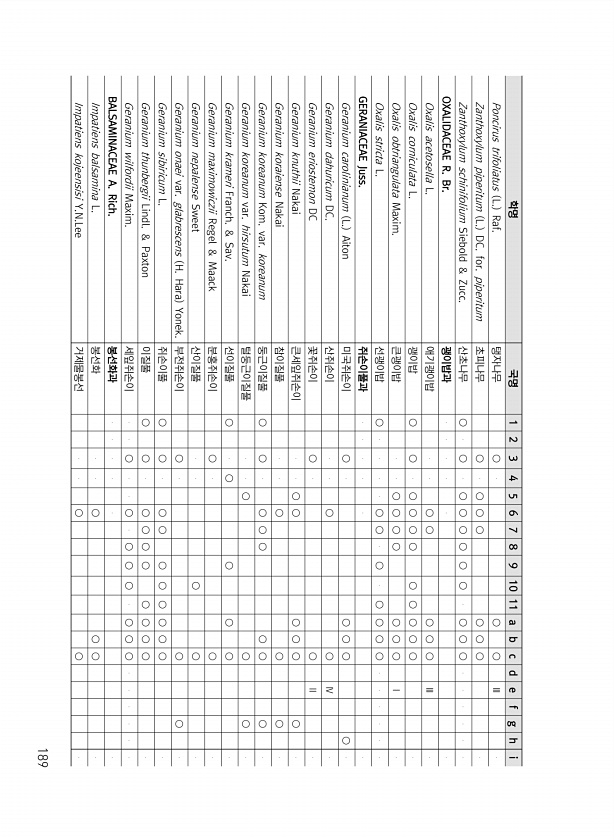 189 학명 국명 1 2 3 4 5 6 7 8 9 10 11 a b c d e f g h i Poncirus trifoliatus L. Raf. 탱자나무 ○ ○ ○ Ⅲ Zanthoxylum piperitum L. DC. for. piperitum 초피나무 ○ ○ ○ ○ ○ ○ ○ Zanthoxylum schinifolium Siebold & Zucc. 산초나무 ○ ○ ○ ○ ○ ○ ○ ○ ○ ○ ○ OXALIDACEAE R. Br. 괭이밥과 Oxalis acetosella L. 애기괭이밥 ○ ○ ○ ○ ○ Ⅲ Oxalis corniculata L. 괭이밥 ○ ○ ○ ○ ○ ○ ○ ○ ○ ○ ○ Oxalis obtriangulata Maxim. 큰괭이밥 ○ ○ ○ ○ ○ ○ ○ Ⅰ Oxalis stricta ...