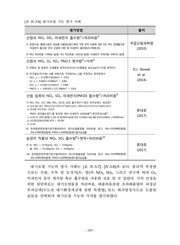 평가방법 출처 산림의 NO2, SO2, 미세먼지 흡수량3 ×처리비용4 국립산림과학원 2010 3 침엽수림, 활엽수림의 임상별 건물생산량ב08년 기준 전국 산림에 의한 SO2, NO2 잠재흡수량 미세먼지 흡수량전국 산림에 의한 총 미세먼지 흡착량 25,700톤/년 4 NO2 처리비용7,440천 원/톤, SO2 처리비용1,821천 원/톤, 미세먼지 처리비용4,967천 원/톤 산림의 NO2, O3, SO2, PM2.5 제거량5 ×가격6 D.J. Nowak et al. 2014 5 연평균 잎 표면의 오염물질 침착속도 m/yr ×오염물질 농도 ㎍/㎥ ×산림 면적 ㎡ 6 인구밀도 인구/㎢, x 를 바탕으로 가격 $/ton, y 을 추정하는 회귀방정식 NO2y = 0.7298+0.6264x r2 = 0.91 O3y =...