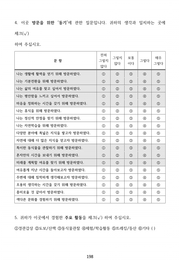 198 4. 이곳 방문을 위한 ‘동기’에 관한 질문입니다. 귀하의 생각과 일치하는 곳에 체크 √ 하여 주십시오. 문 항 전혀 그렇지 않다 그렇지 않다 보통 이다 그렇다 매우 그렇다 나는 생활에 활력을 얻기 위해 방문하였다. ① ② ③ ④ ⑤ 나는 기분전환을 위해 방문하였다. ① ② ③ ④ ⑤ 나는 삶의 여유를 찾고 싶어서 방문하였다. ① ② ③ ④ ⑤ 나는 평안함을 느끼고 싶어서 방문하였다. ① ② ③ ④ ⑤ 마음을 정화하는 시간을 갖기 위해 방문하였다. ① ② ③ ④ ⑤ 나는 휴식을 위해 방문하였다. ① ② ③ ④ ⑤ 나는 정신적 안정을 찾기 위해 방문하였다. ① ② ③ ④ ⑤ 나는 자연학습을 위해 방문하였다. ① ② ③ ④ ⑤ 다양한 분야에 폭넓은 지식을 쌓고자 방문하였다. ① ② ③ ④ ⑤ 자연에 대해...