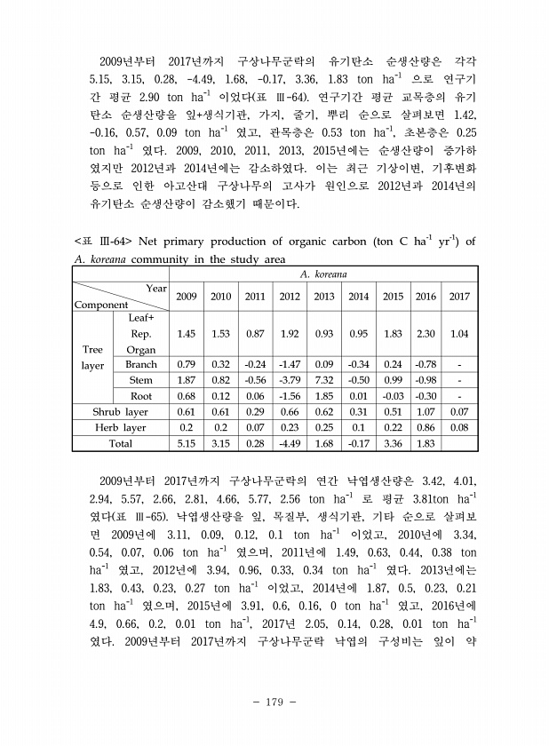 179 2009년부터 2017년까지 구상나무군락의 유기탄소 순생산량은 각각 5.15, 3.15, 0.28, -4.49, 1.68, -0.17, 3.36, 1.83 ton ha-1 으로 연구기 간 평균 2.90 ton ha-1 이었다 표 Ⅲ-64 연구기간 평균 교목층의 유기 탄소 순생산량을 잎+생식기관, 가지, 줄기, 뿌리 순으로 살펴보면 1.42, -0.16, 0.57, 0.09 ton ha-1 였고, 관목층은 0.53 ton ha-1, 초본층은 0.25 ton ha-1 였다. 2009, 2010, 2011, 2013, 2015년에는 순생산량이 증가하 였지만 2012년과 2014년에는 감소하였다. 이는 최근 기상이변, 기후변화 등으로 인한 아고산대 구상나무의 고사가 원인으로 2012년과 2014년의 유기탄소...