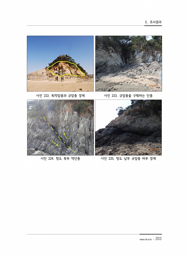 Ⅱ. 조사결과 www.nie.re.kr ? 203 사진 222. 퇴적암층과 규암층 경계 사진 223. 규암층을 구획하는 단층 사진 224. 항도 북부 역단층 사진 225. 항도 남부 규암층 하부경계