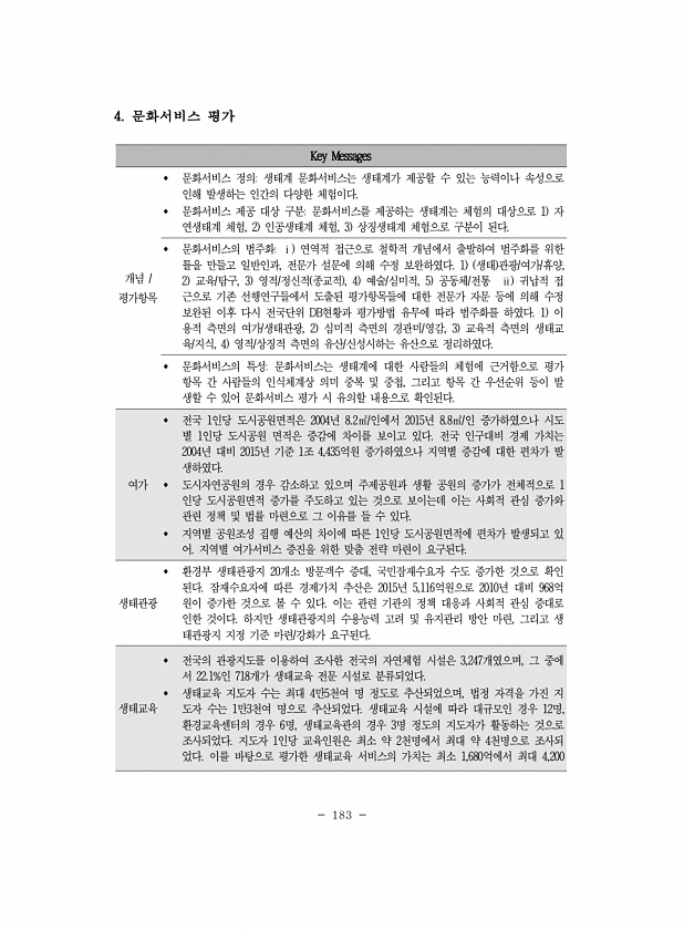 183 Key Messages 개념 평가항목 ? 문화서비스 정의생태계 문화서비스는 생태계가 제공할 수 있는 능력이나 속성으로 인해 발생하는 인간의 다양한 체험이다. ? 문화서비스 제공 대상 구분문화서비스를 제공하는 생태계는 체험의 대상으로 1 자 연생태계 체험, 2 인공생태계 체험, 3 상징생태계 체험으로 구분이 된다. ? 문화서비스의 범주화ⅰ 연역적 접근으로 철학적 개념에서 출발하여 범주화를 위한 틀을 만들고 일반인과, 전문가 설문에 의해 수정 보완하였다. 1 생태 관광/여가/휴양, 2 교육/탐구, 3 영적/정신적 종교적 , 4 예술/심미적, 5 공동체/전통 ⅱ 귀납적 접 근으로 기존 선행연구들에서 도출된 평가항목들에 대한 전문가 자문 등에 의해 수정 보완된 이후 다시 전국단위 DB현황과 평가방법 유무에 ...