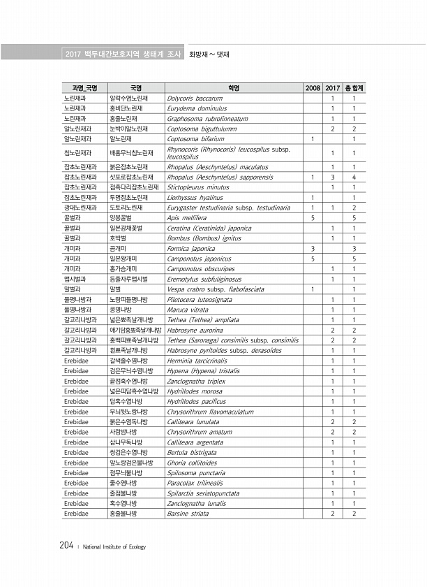 2017 백두대간보호지역 생태계 조사 화방재 댓재 204 ? National Institute of Ecology 과명_국명 국명 학명 2008 2017 총 합계 노린재과 알락수염노린재 Dolycoris baccarum 1 1 노린재과 홍비단노린재 Eurydema dominulus 1 1 노린재과 홍줄노린재 Graphosoma rubrolinneatum 1 1 알노린재과 눈박이알노린재 Coptosoma biguttulumm 2 2 알노린재과 알노린재 Coptosoma bifarium 1 1 침노린재과 배홍무늬침노린재 Rhynocoris Rhynocoris leucospilus subsp. leucospilus 1 1 잡초노린재과 붉은잡초노린재 Rhopalus Aeschyntelus maculatus 1 1 ...