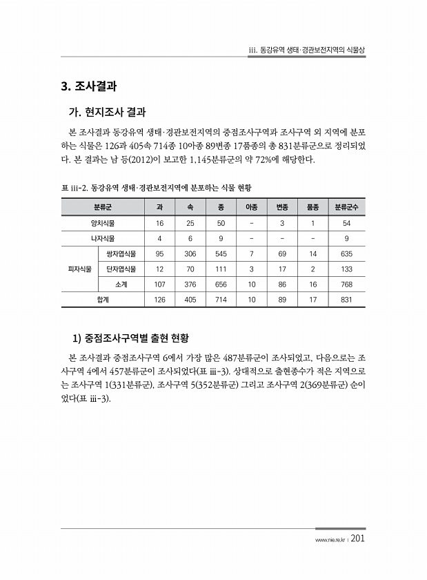 iii. 동강유역 생태·경관보전지역의 식물상 www.nie.re.kr ?201 3. 본 조사결과 동강유역 생태·경관보전지역의 중점조사구역과 조사구역 외 지역에 분포 하는 식물은 126과 405속 714종 10아종 89변종 17품종의 총 831분류군으로 정리되었 다. 본 결과는 남 등 2012 이 보고한 1,145분류군의 약 72%에 해당한다. 분류군 과 속 종 아종 변종 품종 분류군수 양치식물 16 25 50 3 1 54 나자식물 4 6 9 9 피자식물 쌍자엽식물 95 306 545 7 69 14 635 단자엽식물 12 70 111 3 17 2 133 소계 107 376 656 10 86 16 768 합계 126 405 714 10 89 17 831 표 iii-2. 동강유역 생태·경관보전지역에 분포하는 식물...