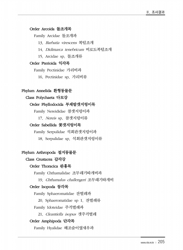 Ⅱ. 조사결과 www.nie.re.kr ? 205 Order Arcoida 돌조개목 Family Arcidae 돌조개과 13. Barbatia virescens 복털조개 14. Didimarca tenebricum 비로도복털조개 15. Arcidae sp. 돌조개류 Order Pterioida 익각목 Family Pectinidae 가리비과 16. Pectinidae sp. 가리비류 Phylum Annelida 환형동물문 Class Polychaeta 다모강 Order Phyllodocida 부채발갯지렁이목 Family Nereididae 참갯지렁이과 17. Nereis sp. 참갯지렁이류 Order Sabellida 꽃갯지렁이목 Family Serpulidae 석회관갯지렁이과 18. Serpulidae s...