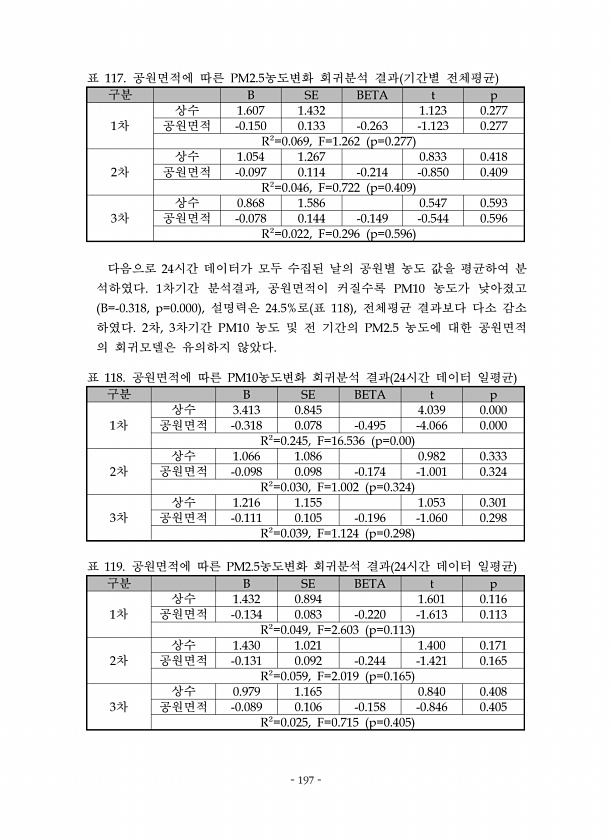 197 구분 차 상수 공원면적 차 상수 공원면적 차 상수 공원면적 표 공원면적에 따른 농도변화 회귀분석 결과 기간별 전체평균 다음으로 시간 데이터가 모두 수집된 날의 공원별 농도 값을 평균하여 분 석하였다 차기간 분석결과 공원면적이 커질수록 농도가 낮아졌고 설명력은 로 표 전체평균 결과보다 다소 감소 하였다 차 차기간 농도 및 전 기간의 농도에 대한 공원면적 의 회귀모델은 유의하지 않았다 구분 차 상수 공원면적 차 상수 공원면적 차 상수 공원면적 표 공원면적에 따른 농도변화 회귀분석 결과 시간 데이터 일평균 구분 차 상수 공원면적 차 상수 공원면적 차 상수 공원면적 표 공원면적에 따른 농도변화 회귀분석 결과 시간 데이터 일평균 197