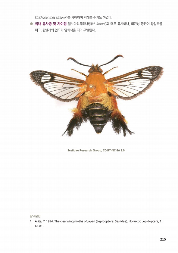 215 참고문헌 1. Arita, Y. 1994. The clearwing moths of Japan LepidopteraSesiidae Holarctic Lepidoptera, 168-81. Sesiidae Research Group, CC-BY-NC-SA 2.0 Trichosanthes kirilowii 를 가해하여 피해를 주기도 하였다. ● 국내 유사종 및 차이점 털보다리유리나방 M. inouei 과 매우 유사하나, 외견상 등판이 황갈색을 띠고, 뒷날개의 연모가 암회색을 띠어구별된다.