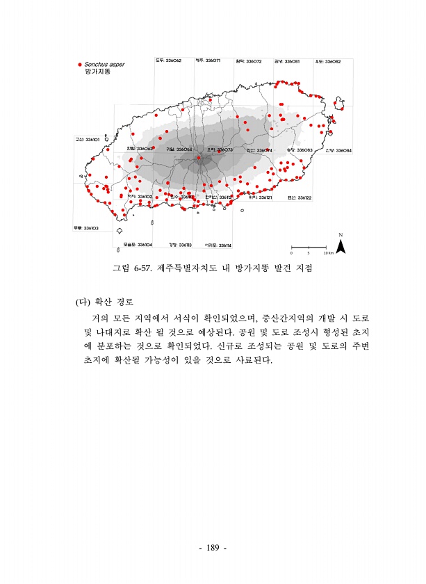 189 그림 6-57. 제주특별자치도 내 방가지똥 발견 지점 다 확산 경로 거의 모든 지역에서 서식이 확인되었으며, 중산간지역의 개발 시 도로 및 나대지로 확산 될 것으로 예상된다. 공원 및 도로 조성시 형성된 초지 에 분포하는 것으로 확인되었다. 신규로 조성되는 공원 및 도로의 주변 초지에 확산될 가능성이 있을 것으로사료된다.