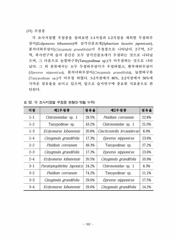 다 우점종 각 조사지점별 우점종을 살펴보면 1-1지점과 1-2지점을 제외한 두점하루 살이 Ecdyonurus kibunensis 와 삼각산골조개 Sphaerium lacustre japonicum , 봄처녀하루살이 Cinygmula grandifolia 가 우점종으로 나타났다. 2구역, 3구 역, 북사면구역 습지 중간은 모두 삼각산골조개가 우점하는 것으로 나타났 으며, 그 다음으로 늪깔따구류 Tanypodinae sp. 가 아우점하는 것으로 나타 났다. 그 외 본류에서는 모두 두점하루살이가 우점하였고, 흰부채하루살이 Epeorus nipponicus , 봄처녀하루살이 Cinygmula grandifolia , 늪깔따구류 Tanypodinae sp. 가 아우점 하였다. 3-2지점에서 80%, 2-2지점에서 5...