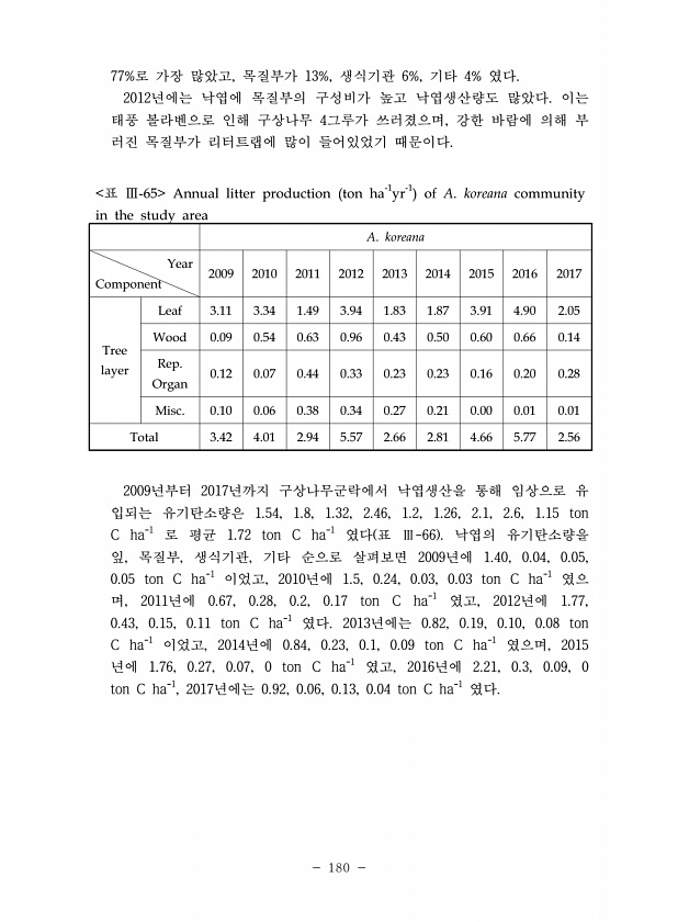 180 77%로 가장 많았고, 목질부가 13%, 생식기관 6%, 기타 4% 였다. 2012년에는 낙엽에 목질부의 구성비가 높고 낙엽생산량도 많았다. 이는 태풍 볼라벤으로 인해 구상나무 4그루가 쓰러졌으며, 강한 바람에 의해 부 러진 목질부가 리터트랩에 많이 들어있었기 때문이다. 표 Ⅲ-65 Annual litter production ton ha-1yr-1 of A. koreana community in the study area A. koreana Year Component 2009 2010 2011 2012 2013 2014 2015 2016 2017 Tree layer Leaf 3.11 3.34 1.49 3.94 1.83 1.87 3.91 4.90 2.05 Wood 0.09 0.54 0.63 0.96 ...