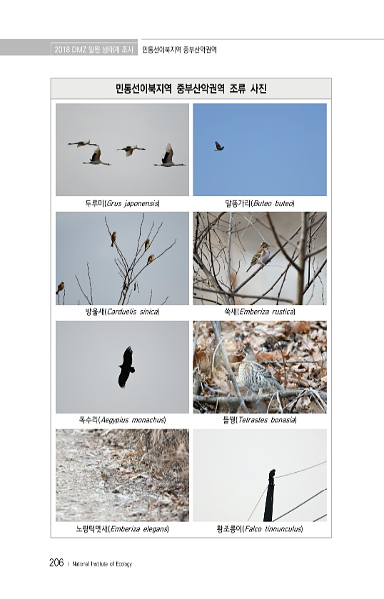 2018 DMZ 일원 생태계 조사 민통선이북지역 중부산악권역 206 ? National Institute of Ecology 민통선이북지역 중부산악권역 조류 사진 두루미 Grus japonensis 말똥가리 Buteo buteo 방울새 Carduelis sinica 쑥새 Emberiza rustica 독수리 Aegypius monachus 들꿩 Tetrastes bonasia 노랑턱멧새 Emberiza elegans 황조롱이 Falco tinnunculus