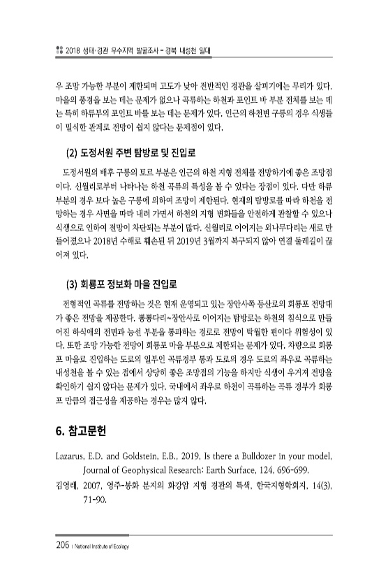 2018 생태·경관 우수지역 발굴조사 경북 내성천 일대 206 ? National Institute of Ecology 우 조망 가능한 부분이 제한되며 고도가 낮아 전반적인 경관을 살피기에는 무리가 있다. 마을의 풍경을 보는 데는 문제가 없으나 곡류하는 하천과 포인트 바 부분 전체를 보는 데 는 특히 하류부의 포인트 바를 보는 데는 문제가 있다. 인근의 하천변 구릉의 경우 식생들 이 밀식한 관계로 전망이 쉽지 않다는 문제점이 있다. 2 도정서원의 배후 구릉의 토르 부분은 인근의 하천 지형 전체를 전망하기에 좋은 조망점 이다. 신월리로부터 나타나는 하천 곡류의 특성을 볼 수 있다는 장점이 있다. 다만 하류 부분의 경우 보다 높은 구릉에 의하여 조망이 제한된다. 현재의 탐방로를 따라 하천을 전 망하는 경우 사면...
