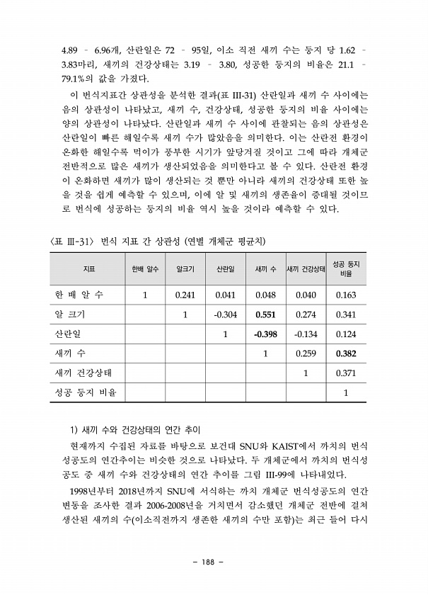 188 4.89 ? 6.96개, 산란일은 72 ? 95일, 이소 직전 새끼 수는 둥지 당 1.62 ? 3.83마리, 새끼의 건강상태는 3.19 ? 3.80, 성공한 둥지의 비율은 21.1 ? 79.1%의 값을 가졌다. 이 번식지표간 상관성을 분석한 결과 표 III-31 산란일과 새끼 수 사이에는 음의 상관성이 나타났고, 새끼 수, 건강상태, 성공한 둥지의 비율 사이에는 양의 상관성이 나타났다. 산란일과 새끼 수 사이에 관찰되는 음의 상관성은 산란일이 빠른 해일수록 새끼 수가 많았음을 의미한다. 이는 산란전 환경이 온화한 해일수록 먹이가 풍부한 시기가 앞당겨질 것이고 그에 따라 개체군 전반적으로 많은 새끼가 생산되었음을 의미한다고 볼 수 있다. 산란전 환경 이 온화하면 새끼가 많이 생산되는 것 뿐만 아니라 새...