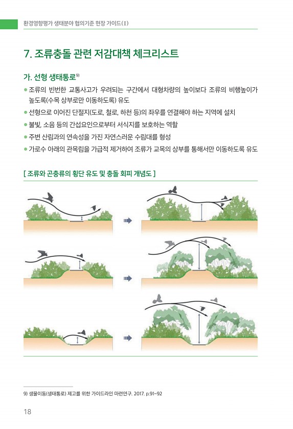 18 환경영향평가 생태분야 협의기준 현장 가이드 Ⅰ 7. 조류충돌 관련 저감대책 체크리스트 가. 선형 생태통로??조류의 빈번한 교통사고가 우려되는 구간에서 대형차량의 높이보다 조류의 비행높이가 높도록 수목 상부로만 이동하도록 유도? 선형으로 이어진 단절지 도로, 철로, 하천 등 의 좌우를 연결해야 하는 지역에 설치? 불빛, 소음 등의 간섭요인으로부터 서식지를 보호하는 역할? 주변 산림과의 연속성을 가진 자연스러운 수림대를 형성? 가로수 아래의 관목림을 가급적 제거하여 조류가 교목의 상부를 통해서만 이동하도록 유도 [ 조류와 곤충류의 횡단 유도 및 충돌 회피 개념도 ] 9 생물이동 생태통로 제고를 위한 가이드라인 마련연구. 2017.p.9192