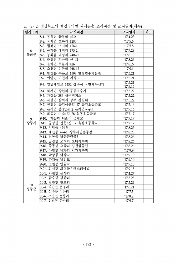 표 Ⅳ- 2. 경상북도의 행정구역별 외래곤충 조사지점 및 조사일자 계속 행정구역 조사지점 조사일자 비고 8. 봉화군 8-1. 봉성면 금봉리 40-2 17.4.23 8-2. 물야면 오록리 1280 17.5.6 8-3. 법전면 어지리 176-1 17.5.8 8-4. 봉화읍 해저리 173-2 17.7.29 8-5. 봉화읍 내성리 240-25 17.8.10 8-6. 춘양면 학산리 산 42 17.8.26 8-7. 물야면 두문리 426 17.8.27 8-8. 소천면 현동리 918-12 17.9.1 9. 상주시 9-1. 함창읍 무운로 1593 함창명주박물관 17.5.21 9-2. 이안면 아천리 지평지 17.5.21 9-3. 영남제일로 1432 상주시 국민체육센터 17.5.21 ‘17.9.16 9-4. 화서면 상현리 무동...