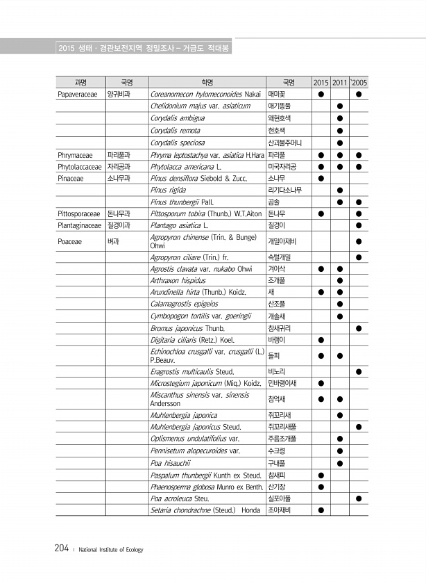 2015 생태·경관보전지역 정밀조사 거금도 적대봉 204 ? National Institute of Ecology 과명 국명 학명 국명 2015 2011 `2005 Papaveraceae 양귀비과 Coreanomecon hylomeconoides Nakai 매미꽃 ● ● Chelidonium majus var. asiaticum 애기똥풀 ● Corydalis ambigua 왜현호색 ● Corydalis remota 현호색 ● Corydalis speciosa 산괴불주머니 ● Phrymaceae 파리풀과 Phryma leptostachya var. asiatica H.Hara 파리풀 ● ● ● Phytolaccaceae 자리공과 Phytolacca americana L. 미국자리공 ● ● ● Pinaceae ...