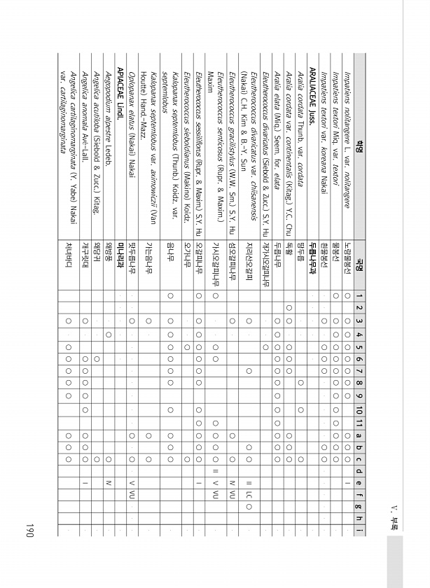 Ⅴ. 부록 190 학명 국명 1 2 3 4 5 6 7 8 9 10 11 a b c d e f g h i Impatiens nolitangere L. var. nolitangere 노랑물봉선 ○ ○ ○ ○ ○ ○ ○ ○ ○ ○ ○ Ⅰ Impatiens textori Miq. var. textori 물봉선 ○ ○ ○ ○ ○ ○ ○ ○ ○ ○ ○ ○ ○ Impatiens textori var. koreana Nakai 흰물봉선 ○ ○ ○ ○ ○ ○ ARALIACEAE Juss. 두릅나무과 Aralia cordata Thunb. var. cordata 땅두릅 ○ ○ ○ Aralia cordata var. continentalis Kitag. Y.C. Chu 독활 ○ ○ ○ ○ ○ ○ ○ ○ Aralia elata ...