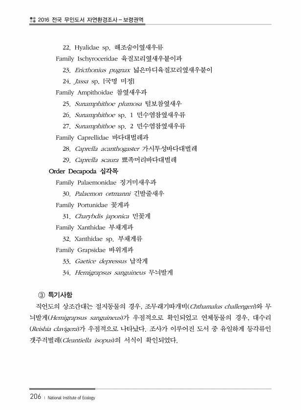 2016 전국 무인도서 자연환경조사 보령권역 206 ? National Institute of Ecology 22. Hyalidae sp. 해조숨이옆새우류 Family Ischyroceridae 육질꼬리옆새우붙이과 23. Ericthonius pugnax 넓은마디육질꼬리옆새우붙이 24. Jassa sp. [국명 미정] Family Ampithoidae 참옆새우과 25. Sunamphithoe plumosa 털보참옆새우 26. Sunamphithoe sp. 1 민수염참옆새우류 27. Sunamphithoe sp. 2 민수염참옆새우류 Family Caprellidae 바다대벌레과 28. Caprella acanthogaster 가시투성바다대벌레 29. Caprella scaura 뾰족머리바다대벌레 Order D...
