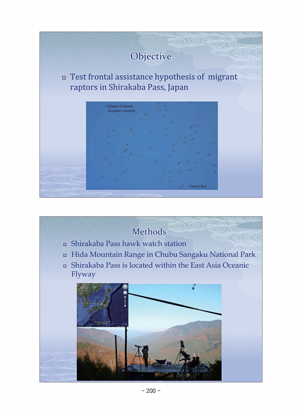 Methods ? Shirakaba Pass hawk watch station ? Hida Mountain Range in Chubu Sangaku National Park ? Shirakaba Pass is located within the East Asia Oceanic Flyway Objective ? Test frontal assistance hypothesis of migrant raptors in Shirakaba Pass, Japan 200
