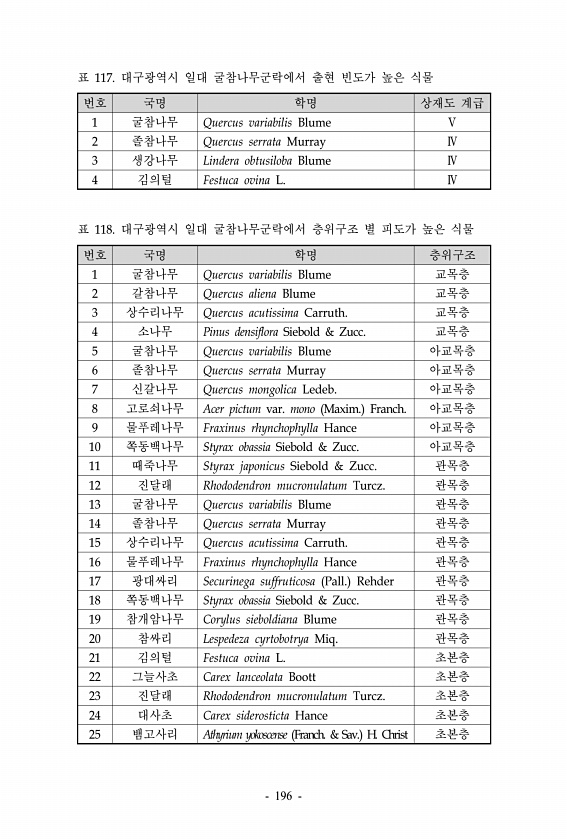 번호 국명 학명 상재도 계급 1 굴참나무 Quercus variabilis Blume Ⅴ 2 졸참나무 Quercus serrata Murray Ⅳ 3 생강나무 Lindera obtusiloba Blume Ⅳ 4 김의털 Festuca ovina L. Ⅳ 표 117. 대구광역시 일대 굴참나무군락에서 출현 빈도가 높은 식물 번호 국명 학명 층위구조 1 굴참나무 Quercus variabilis Blume 교목층 2 갈참나무 Quercus aliena Blume 교목층 3 상수리나무 Quercus acutissima Carruth. 교목층 4 소나무 Pinus densiflora Siebold & Zucc. 교목층 5 굴참나무 Quercus variabilis Blume 아교목층 6 졸참나무 Quercus serr...