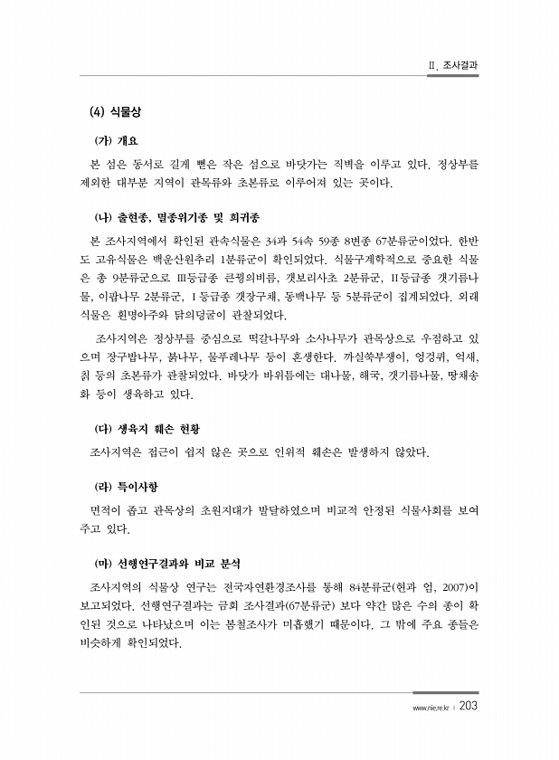 Ⅱ. 조사결과 www.nie.re.kr ? 203 4 식물상 가 개요 본 섬은 동서로 길게 뻗은 작은 섬으로 바닷가는 직벽을 이루고 있다. 정상부를 제외한 대부분 지역이 관목류와 초본류로 이루어져 있는 곳이다. 나 출현종, 멸종위기종 및 희귀종 본 조사지역에서 확인된 관속식물은 34과 54속 59종 8변종 67분류군이었다. 한반 도 고유식물은 백운산원추리 1분류군이 확인되었다. 식물구계학적으로 중요한 식물 은 총 9분류군으로 Ⅲ등급종 큰꿩의비름, 갯보리사초 2분류군, Ⅱ등급종 갯기름나 물, 이팝나무 2분류군, Ⅰ등급종 갯장구채, 동백나무 등 5분류군이 집계되었다. 외래 식물은 흰명아주와 닭의덩굴이 관찰되었다. 조사지역은 정상부를 중심으로 떡갈나무와 소사나무가 관목상으로 우점하고 있 으며 장구밥나무, 붉나무,...