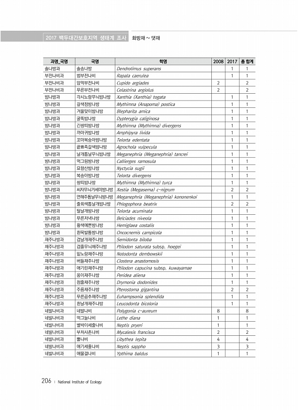 2017 백두대간보호지역 생태계 조사 화방재 댓재 206 ? National Institute of Ecology 과명_국명 국명 학명 2008 2017 총 합계 솔나방과 솔송나방 Dendrolimus superans 1 1 부전나비과 범부전나비 Rapala caerulea 1 1 부전나비과 암먹부전나비 Cupido argiades 2 2 부전나비과 푸른부전나비 Celastrina argiolus 2 2 밤나방과 각시노랑무늬밤나방 Xanthia Xanthia togata 1 1 밤나방과 갈색점밤나방 Mythimna Anapoma postica 1 1 밤나방과 겨울맞이밤나방 Blepharita amica 1 1 밤나방과 굴뚝밤나방 Dypterygia caliginosa 1 1 밤나방과 긴쌍띠밤나방 Mythim...