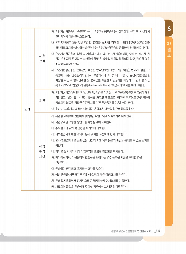 환경부 유전자변형생물체 안전관리 가이드 _217 6 별 표 3 곤 충 사 육 관 리 가. 유전자변형곤충의 육종관리는 비유전자변형곤충과는 철저하게 분리된 시설에서 관리되어야 함을 원칙으로 한다. 나. 유전자변형곤충을 일반곤충과 교미를 실시할 경우에는 비유전자변형곤충이라 하더라도 교미를 실시하는 순간부터는 유전자변형곤충과 동일하게 관리되어야 한다. 다. 유전자변형곤충의 실험 및 사육과정에서 발생된 부산물 배설물, 탈피각, 폐사체 등 전이 유전자가 존재하는 부산물에 한함 은 불활성화 처리를 하여야 하고, 필요한 경우 소각 처리하여야 한다. 라. 유전자변형곤충은 분류군별 적절한 발육단계별로 알, 유충 약충 , 번데기, 성충 그 특성에 따른 안전관리시설에서 보관하거나 사육되어야 한다. 유전자변형곤충을 이동할 시는 각...