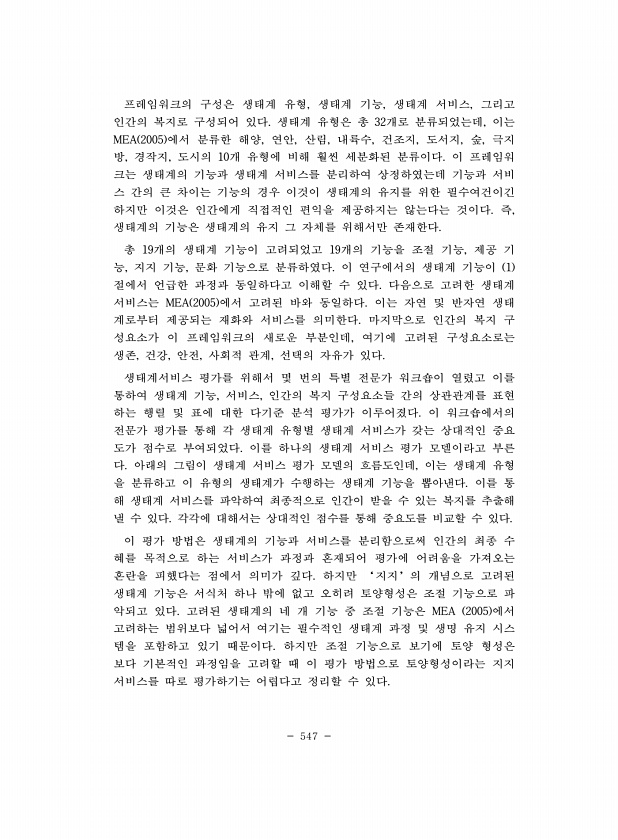 547 프레임워크의 구성은 생태계 유형, 생태계 기능, 생태계 서비스, 그리고 인간의 복지로 구성되어 있다. 생태계 유형은 총 32개로 분류되었는데, 이는 MEA 2005 에서 분류한 해양, 연안, 산림, 내륙수, 건조지, 도서지, 숲, 극지 방, 경작지, 도시의 10개 유형에 비해 훨씬 세분화된 분류이다. 이 프레임워 크는 생태계의 기능과 생태계 서비스를 분리하여 상정하였는데 기능과 서비 스 간의 큰 차이는 기능의 경우 이것이 생태계의 유지를 위한 필수여건이긴 하지만 이것은 인간에게 직접적인 편익을 제공하지는 않는다는 것이다. 즉, 생태계의 기능은 생태계의 유지 그 자체를 위해서만 존재한다. 총 19개의 생태계 기능이 고려되었고 19개의 기능을 조절 기능, 제공 기 능, 지지 기능, 문화 기능으로 분류하였...