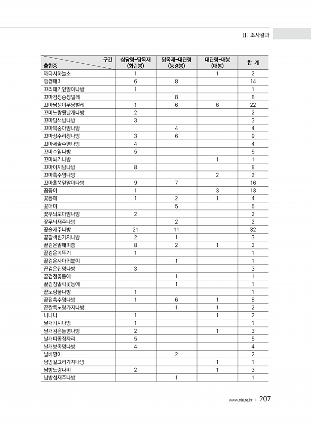 Ⅱ. 조사결과 www.nie.re.kr ? 207 구간 출현종 삽당령닭목재 화란봉 닭목재대관령 능경봉 대관령매봉 매봉 합 계 깨다시하늘소 1 1 2 깽깽매미 6 8 14 꼬리애기잎말이나방 1 1 꼬마검정송장벌레 8 8 꼬마남생이무당벌레 1 6 6 22 꼬마노랑뒷날개나방 2 2 꼬마담색밤나방 3 3 꼬마복숭아밤나방 4 4 꼬마상수리창나방 3 6 9 꼬마세줄수염나방 4 4 꼬마수염나방 5 5 꼬마쐐기나방 1 1 꼬마이끼밤나방 8 8 꼬마혹수염나방 2 2 꼬마홀쭉잎말이나방 9 7 16 꼽등이 1 3 13 꽃등에 1 2 1 4 꽃매미 5 5 꽃무늬꼬마밤나방 2 2 꽃무늬재주나방 2 2 꽃술재주나방 21 11 32 끝갈색흰가지나방 2 1 3 끝검은말매미충 8 2 1 2 끝검은메뚜기 1 1 끝검은사마귀붙이 1 1 끝검...