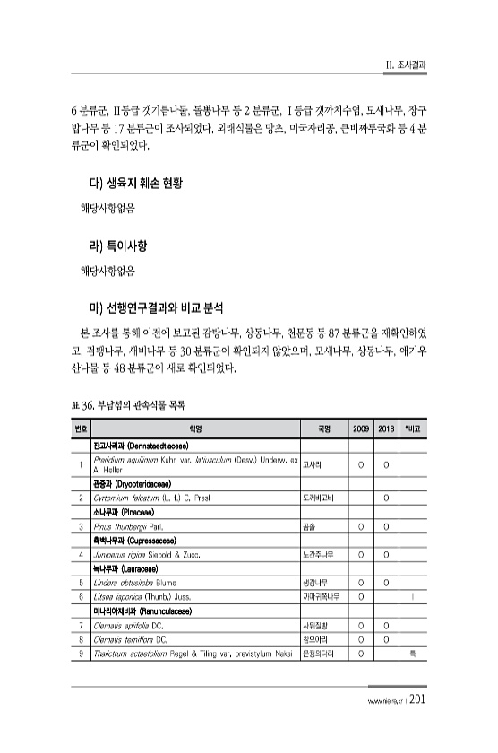 II. 조사결과 www.nie.re.kr ?201 6 분류군, Ⅱ등급 갯기름나물, 돌뽕나무 등 2 분류군, Ⅰ등급 갯까치수염, 모새나무, 장구 밥나무 등 17 분류군이 조사되었다. 외래식물은 망초, 미국자리공, 큰비짜루국화 등 4 분 류군이 확인되었다. 해당사항없음 해당사항없음 본 조사를 통해 이전에 보고된 감탕나무, 상동나무, 천문동 등 87 분류군을 재확인하였 고, 검팽나무, 새비나무 등 30 분류군이 확인되지 않았으며, 모새나무, 상동나무, 애기우 산나물 등 48 분류군이 새로 확인되었다. 번호 학명 국명 2009 2018 *비고 잔고사리과 Dennstaedtiaceae 1 Pteridium aquilinum Kuhn var. latiusculum Desv. Underw. ex A. Heller 고사리...