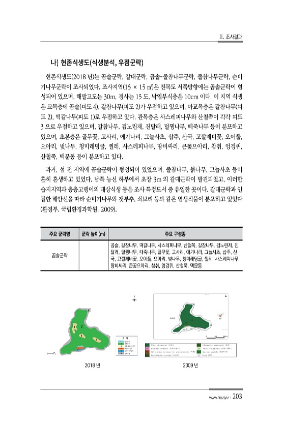II. 조사결과 www.nie.re.kr ?203 , 현존식생도 2018 년 는 곰솔군락, 갈대군락, 곰솔-졸참나무군락, 졸참나무군락, 순비 기나무군락이 조사되었다. 조사지역 15 × 15 ㎡ 은 진목도 서쪽방향에는 곰솔군락이 형 성되어 있으며, 해발고도는 30m, 경사는 15 도, 낙엽부식층은 10cm 이다. 이 지역 식생 은 교목층에 곰솔 피도 4 , 갈참나무 피도 2 가 우점하고 있으며, 아교목층은 갈참나무 피 도 2 , 떡갈나무 피도 1 로 우점하고 있다. 관목층은 사스레피나무와 산철쭉이 각각 피도 3 으로 우점하고 있으며, 갈참나무, 검노린재, 진달래, 덜꿩나무, 떼죽나무 등이 분포하고 있으며, 초본층은 골무꽃, 고사리, 애기나리, 그늘사초, 삽주, 산국, 고깔제비꽃, 오이풀, 으아리, 벚나무, 청...