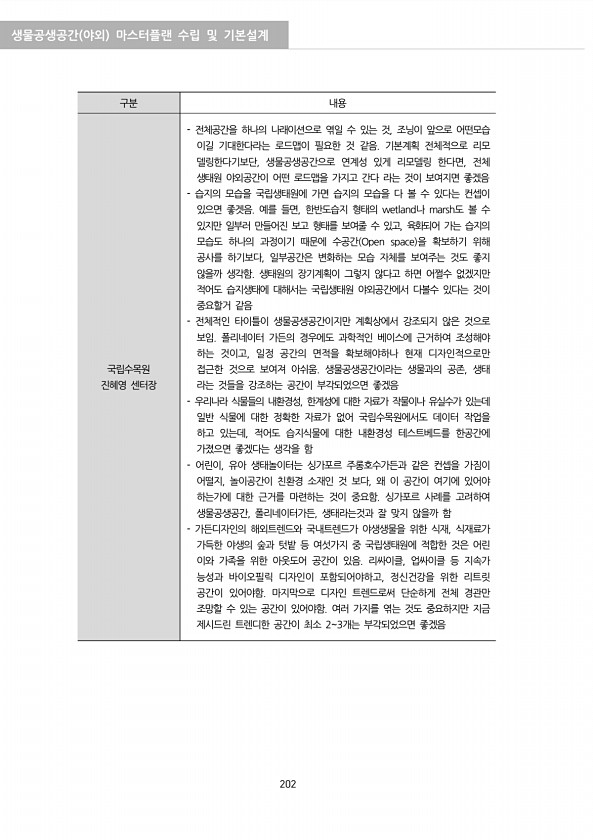 생물공생공간 야외 마스터플랜 수립 및 기본설계 202 구분 내용 국립수목원 진혜영 센터장 전체공간을 하나의 나래이션으로 엮일 수 있는 것, 조닝이 앞으로 어떤모습 이길 기대한다라는 로드맵이 필요한 것 같음. 기본계획 전체적으로 리모 델링한다기보단, 생물공생공간으로 연계성 있게 리모델링 한다면, 전체 생태원 야외공간이 어떤 로드맵을 가지고 간다 라는 것이 보여지면 좋겠음 습지의 모습을 국립생태원에 가면 습지의 모습을 다 볼 수 있다는 컨셉이 있으면 좋겟음. 예를 들면, 한반도습지 형태의 wetland나 marsh도 볼 수 있지만 일부러 만들어진 보고 형태를 보여줄 수 있고, 육화되어 가는 습지의 모습도 하나의 과정이기 때문에 수공간 Open space 을 확보하기 위해 공사를 하기보다, 일부공간은 변화하는 모...
