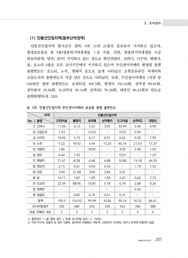 Ⅱ. 조사결과 www.nie.re.kr ? 207 1 민통선인접지역 동부산악권역 민통선인접지역 현지조사 결과, 6목 11과 21종의 포유류가 서식하고 있으며, 법정보호종은 총 5종 멸종위기야생생물 Ⅰ급 수달, 산양, 멸종위기야생생물 Ⅱ급 하늘다람쥐, 담비, 삵 이 서식하고 있는 것으로 확인되었다. 고라니, 너구리, 멧돼지, 삵, 오소리 5종은 모든 조사구간에서 서식하고 있으며 무인센서카메라 촬영된 종별 출현빈도는 오소리, 노루, 멧돼지 순으로 높게 나타났고 소형포유류인 족제비와 고슴도치의 출현빈도가 가장 낮은 것으로 나타났다. 또한, 무인센서카메라 1지점 당 100일간 평균 출현빈도는 오천터널 109.5회, 월명리 154.02회, 성곡령 89.81회, 상무룡리 35.66회, 도고터널 90.14회 심적리2 5...