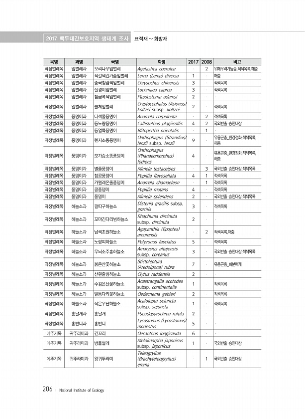 2017 백두대간보호지역 생태계 조사 묘적재 화방재 206 ? National Institute of Ecology 목명 과명 국명 학명 2017 2008 비고 딱정벌레목 잎벌레과 오리나무잎벌레 Agelastica coerulea 2 위해우려가능종,적색목록,해충 딱정벌레목 잎벌레과 적갈색긴가슴잎벌레 Lema Lema diversa 1 해충 딱정벌레목 잎벌레과 중국청람색잎벌레 Chrysochus chinensis 3 적색목록 딱정벌레목 잎벌레과 질경이잎벌레 Lochmaea caprea 3 적색목록 딱정벌레목 잎벌레과 참금록색잎벌레 Plagiosterna adamsi 2 딱정벌레목 잎벌레과 콜체잎벌레 Cryptocephalus Asionus koltzei subsp. koltzei 2 적색...