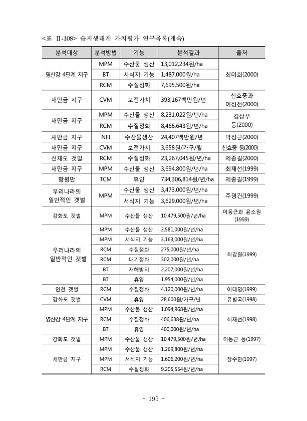 195 분석대상 분석방법 기능 분석결과 출처 영산강 4단계 지구 MPM 수산물 생산 13,012,234원/ha BT 서식지 기능 1,487,000원/ha 최미희 2000 RCM 수질정화 7,695,500원/ha 새만금 지구 CVM 보전가치 393,167백만원/년 신효중과 이정전 2000 새만금 지구 MPM 수산물 생산 8,231,022원/년/ha 김상우 RCM 수질정화 8,466,643원/년/ha 등 2000 새만금 지구 NFI 수산물생산 24,407백만원/년 박정근 2000 새만금 지구 CVM 보전가치 3,658원/가구/월 신효중 등 2000 선재도 갯벌 RCM 수질정화 23,267,045원/년/ha 제종길 2000 새만금 지구 MPM 수산물 생산 3,694,800원/년/ha 최재선 1999 함평만 TCM...