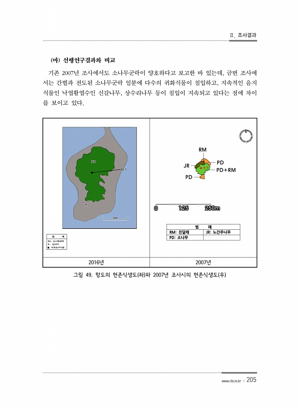 Ⅱ. 조사결과 www.nie.re.kr ? 205 마 선행연구결과와 비교 기존 2007년 조사에서도 소나무군락이 양호하다고 보고한 바 있는데, 금번 조사에 서는 간벌과 전도된 소나무군락 임분에 다수의 귀화식물이 침입하고, 지속적인 음지 식물인 낙엽활엽수인 신갈나무, 상수리나무 등이 침입이 지속되고 있다는 점에 차이 를 보이고 있다. 범 례 RM진달래 JR노간주나무 PD소나무 2016년 2007년 그림 49. 항도의 현존식생도 좌 와 2007년 조사시의 현존식생도 우