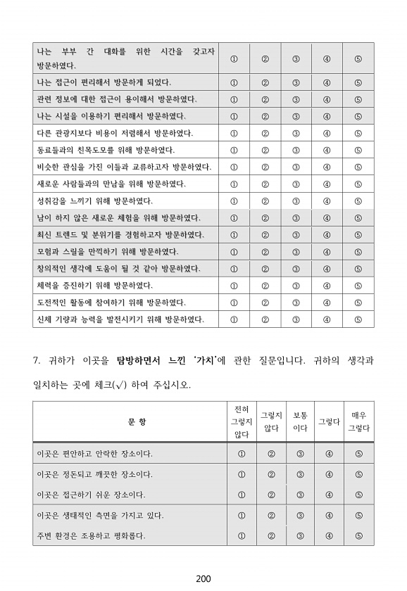 200 나는 부부 간 대화를 위한 시간을 갖고자 방문하였다. ① ② ③ ④ ⑤ 나는 접근이 편리해서 방문하게 되었다. ① ② ③ ④ ⑤ 관련 정보에 대한 접근이 용이해서 방문하였다. ① ② ③ ④ ⑤ 나는 시설을 이용하기 편리해서 방문하였다. ① ② ③ ④ ⑤ 다른 관광지보다 비용이 저렴해서 방문하였다. ① ② ③ ④ ⑤ 동료들과의 친목도모를 위해 방문하였다. ① ② ③ ④ ⑤ 비슷한 관심을 가진 이들과 교류하고자 방문하였다. ① ② ③ ④ ⑤ 새로운 사람들과의 만남을 위해 방문하였다. ① ② ③ ④ ⑤ 성취감을 느끼기 위해 방문하였다. ① ② ③ ④ ⑤ 남이 하지 않은 새로운 체험을 위해 방문하였다. ① ② ③ ④ ⑤ 최신 트렌드 및 분위기를 경험하고자 방문하였다. ① ② ③ ④ ⑤ 모험과 스릴을 만끽하기...