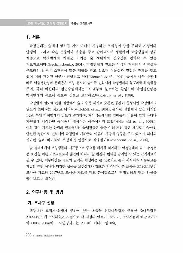 2017 백두대간 생태계 정밀조사 구룡산 고정조사구 208 ? National Institute of Ecology 1. 서론 딱정벌레는 숲에서 땅위를 기어 다니며 사냥하는 포식성이 강한 무리로 지렁이와 달팽이, 그리고 작은 곤충이나 유충을 주로 잡아먹으며 생활하여 토양생물의 상위 계층으로 딱정벌레의 개체군 크기는 숲 생태계의 건강성을 평가할 수 있는 지표자료이다 Grechanichenko, 2001 딱정벌레의 밀도는 서식지 패치들의 이질성과 분포타입 같은 미소환경에 많은 영향을 받고 있으며 식물상과 밀접한 관계를 맺고 있어 이와 관련된 연구가 진행되고 있다 Niemel? et al., 1992 숲에서 나무 수종에 따른 낙엽생산량과 분해율은 토양 온도와 습도를 변화시켜 딱정벌레의 분포패턴에 영향을 주며, 특...