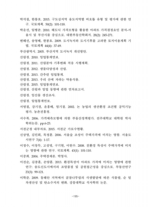 -195- 박석철 한봉호 구도심지역 용도지역별 비오톱 유형 및 평가에 관한 연 구 국토계획 박운선 임병준 헤도닉 가격모형을 활용한 아파트 가격결정요인 분석 서 울시 및 부산시를 중심으로 대한부동산학회지 변혜선 송영배 한봉호 도시녹지와 도시기후를 고려한 토지이용계획 기 법 국토계획 부산광역시 부산지역 도시녹지 개선방안 산림청 임업통계연보 산림청 산림분야 기후변화 적응 시행계획 산림청 생물다양성과 산림 산림청 간추린 임업통계 산림청 우리 산에 자라는 약용식물 산림청 임업통계연보 산림청 산림과 임업 동향에 관한 연차보고서 산림청 임산물 생산조사 산림청 임업통계연보 서명철 강기경 윤홍배 엄기철 논 농업의 생산환경 조건별 공익기능 평가 농촌진흥청 서수복 가격예측모형에 의한 부동산정책평가 전주대학교 대학원 박사 학위논...