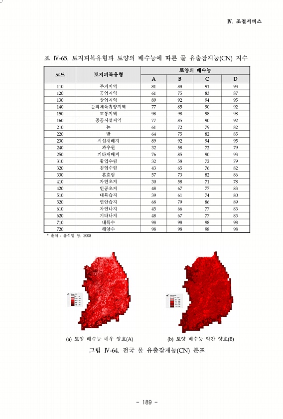 Ⅳ. 조절서비스 189 코드 토지피복유형 토양의 배수능 A B C D 110 주거지역 81 88 91 93 120 공업지역 61 75 83 87 130 상업지역 89 92 94 95 140 문화체육휴양지역 77 85 90 92 150 교통지역 98 98 98 98 160 공공시설지역 77 85 90 92 210 논 61 72 79 82 220 밭 64 75 82 85 230 시설재배지 89 92 94 95 240 과수원 32 58 72 79 250 기타재배지 76 85 90 93 310 활엽수림 32 58 72 79 320 침엽수림 43 65 76 82 330 혼효림 57 73 82 86 410 자연초지 30 58 71 78 420 인공초지 48 67 77 83 510 내륙습지 39 61 74 80 520 ...