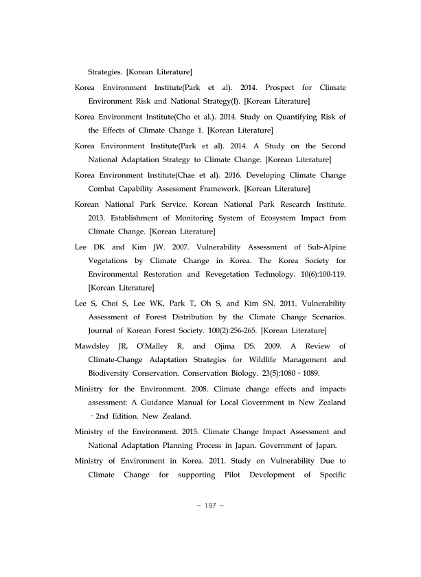 Strategies. [Korean Literature] Korea Environment Institute Park et al 2014. Prospect for Climate Environment Risk and National Strategy I [Korean Literature] Korea Environment Institute Cho et al. 2014. Study on Quantifying Risk of the Effects of Climate Change 1. [Korean Literature] Korea Environment Institute Park et al 2014. A Study on the Second National Adaptation Strategy to Climate Change....